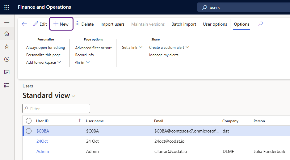 To create a new user, complete the following steps in Microsoft Dynamics 365 F&O: